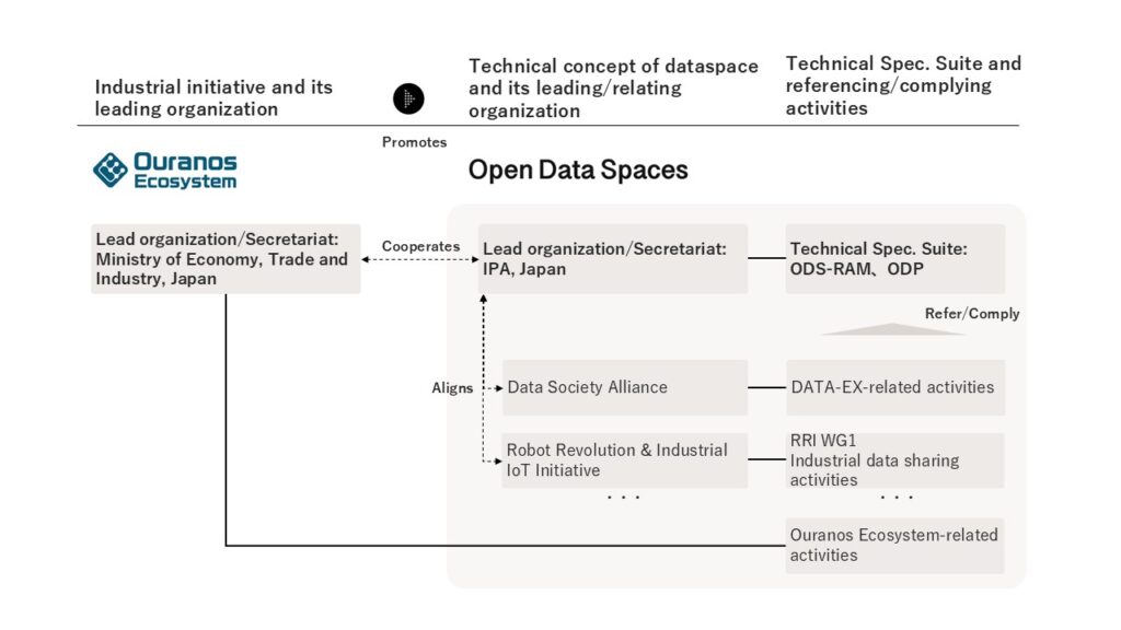 Open Data Spaces is an open, technology-neutral technical concept promoted through the Ouranos Ecosystem, an industrial initiative led by the METI, and consists of a suite of technical specifications (standards proposals). The renaming and re-positioning from Ouranos Ecosystem Data Spaces to Open Data Spaces and the resulting changes in relationships are summarized in Figure 3 and Table 2.